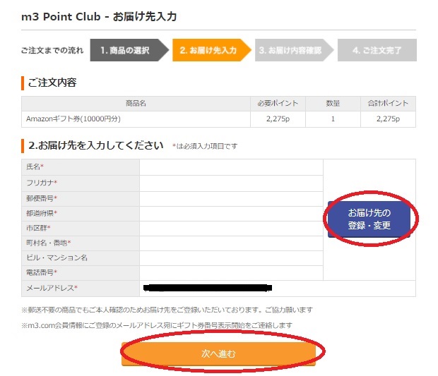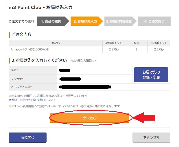 お届け先に間違いがなければ“次へ進む”をクリックします