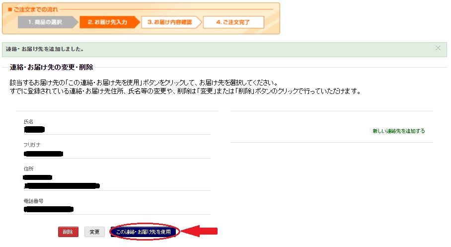 内容を確認後“この連絡・お届け先を使用”をクリックします