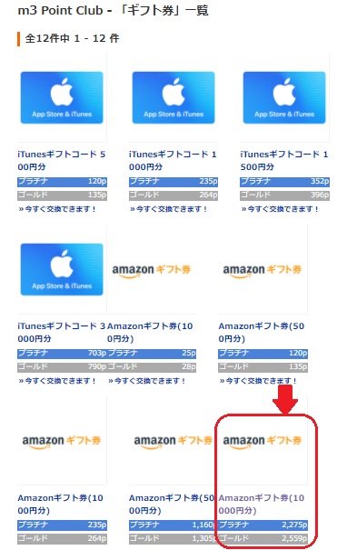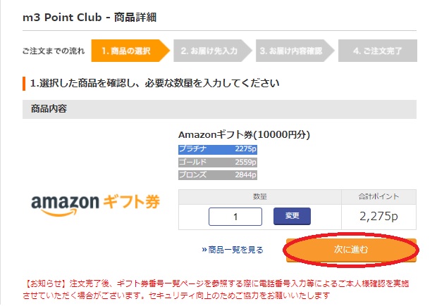 交換したい金額のAmazonギフト券を選択します(今回は10000円を交換)