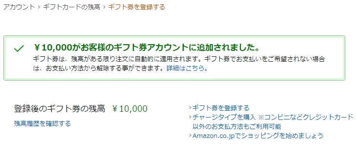上記のような画面になり、10000円分のギフト券の登録が完了となります