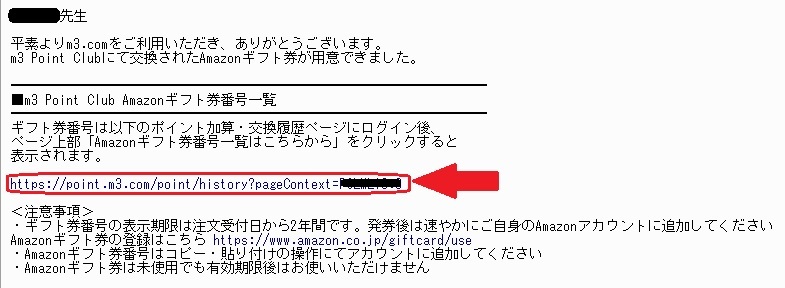 メールのお知らせにあるURLをクリックし、ギフト券番号を確認する為移行したサイト内の