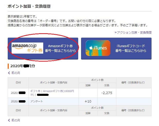 メールの中のポイント交換履歴のサイトにアクセスすると下記のような画面が表示されます