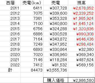 実際の年間発電量と売電収入情報(2011年~2022年)