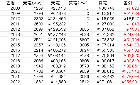 ただ、子供2人が高校生(各自室で過ごす事が増えた)になった上で、2008年以前の(ガス+電気:23000円/月)生活よりも節約できていることを考えれば、オール電化+太陽光パネル設置の恩恵はあるように思います。