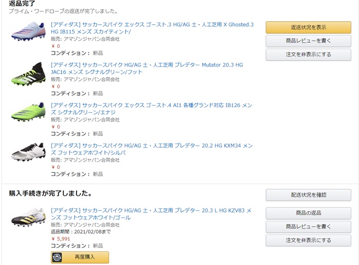 早速プレデターとXシリーズから25.5センチのスパイクを5点選びました