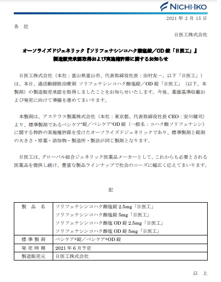 安定供給を優先という事でソリフェナシンコハク酸塩錠「日医工」は見送りとの事です。