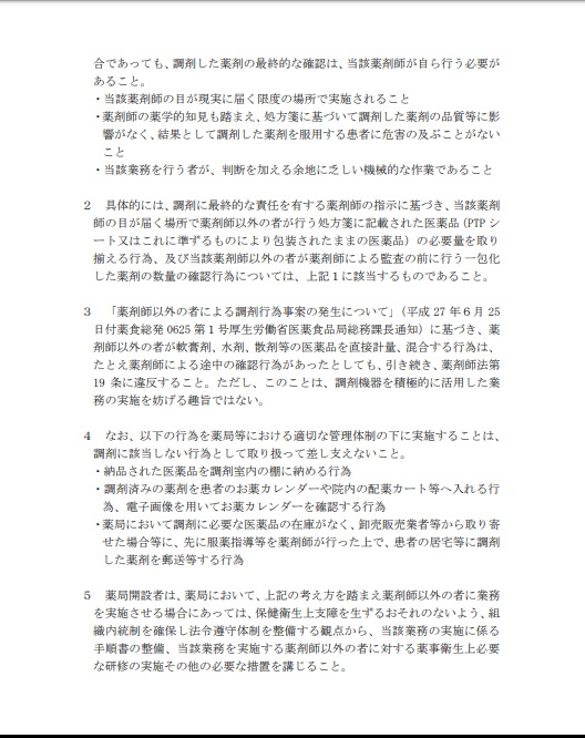 「薬剤師以外の者による調剤行為事案の発生について」(平成 27 年6月 25日付薬食総発 0625 第1号厚生労働省医薬食品局総務課長通知)に基づき、薬剤師以外の者が軟膏剤、水剤、散剤等の医薬品を直接計量、混合する行為は、たとえ薬剤師による途中の確認行為があったとしても、引き続き、薬剤師法第19 条に違反すること。ただし、このことは、調剤機器を積極的に活用した業務の実施を妨げる趣旨ではない。