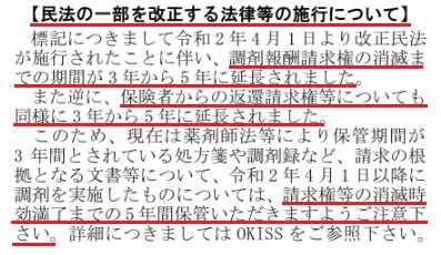 他にも、「生活保護法」、「児童福祉法」、「難病の患者に対する医療等に関する法律」、「結核予防法」の中の規程により5年保管が必要な処方箋があるから知っとくとええわ。