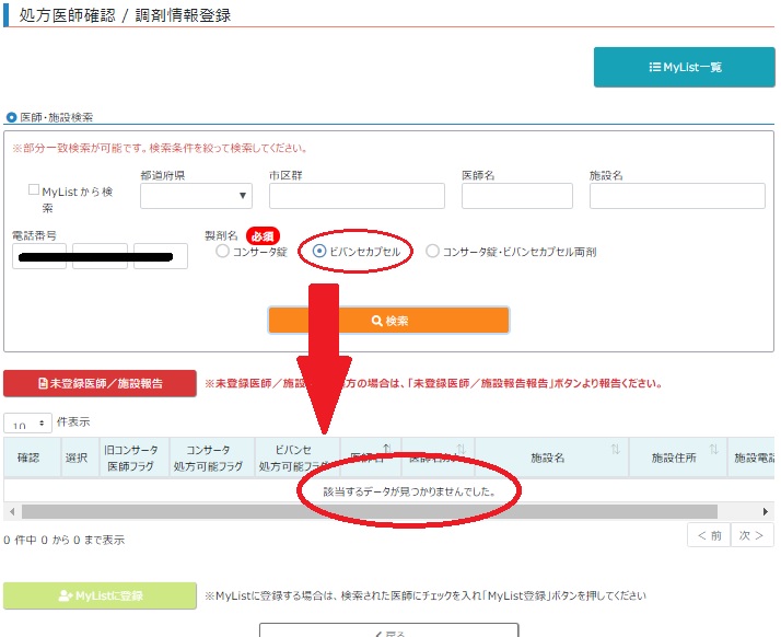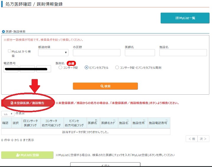 また、医師、施設検索は部分一致で検索できるようなので電話番号で検索してみました。