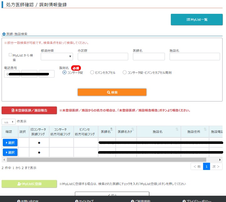 下記の医師・施設検索画面では、「旧コンサータ医師フラグ」、及び「コンサータ処方可能フラグ」の両方にチェックが入っている医師が初めて登場しました!!