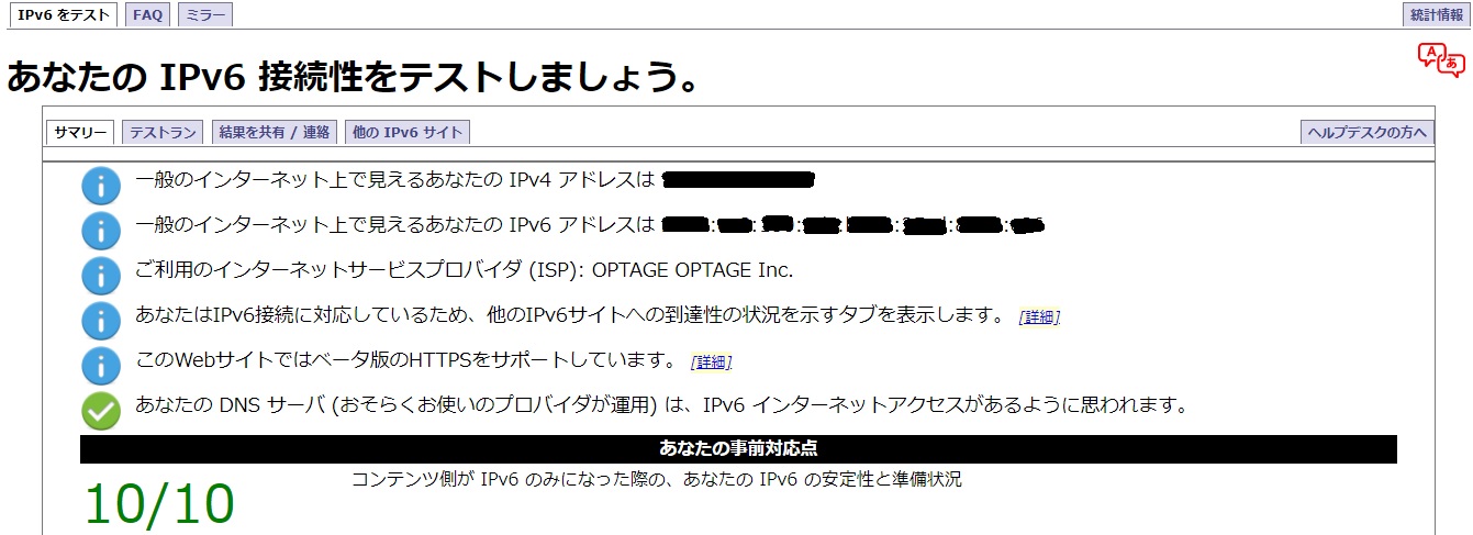 でも自分のIPアドレス知らんわ~っていう人もおるやろな?そういう人はこっちのサイトにアクセスしてみてな。「IPv6 確認」って検索してもええで~。