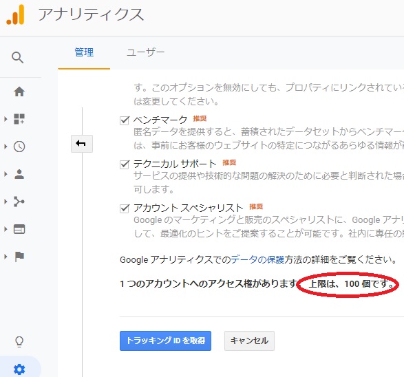 「+アカウント作成」を開いて、赤く囲んだところを見てや、100個ってあるやろ?1つのGoogleアカウントでアナリティクスのアカウントを100個まで追加できるって事なんや。