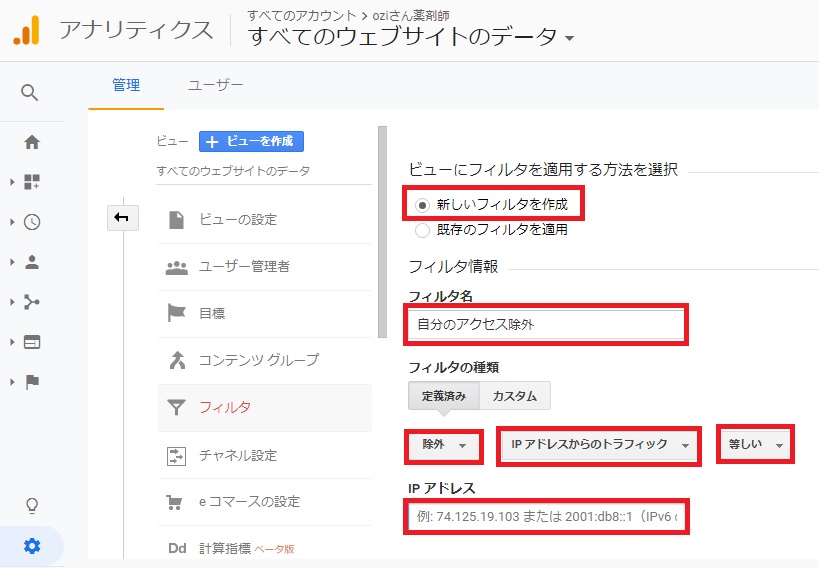 上記の赤枠の入力を行い保存をクリックしたら設定終わり。IPアドレスのところにさっき調べた「IPv4 アドレス」か「IPv6 アドレス」を入力してな~。IPv4かIPv6のどっちか分からない場合は更にフィルタを追加して2つともフィルタかけたら間違いないと思うよ。フィルタ名を「自分のアクセス除外IPv4」、「自分のアクセス除外IPv6」ってしたらあとから確認するときに分かりやすいよ。