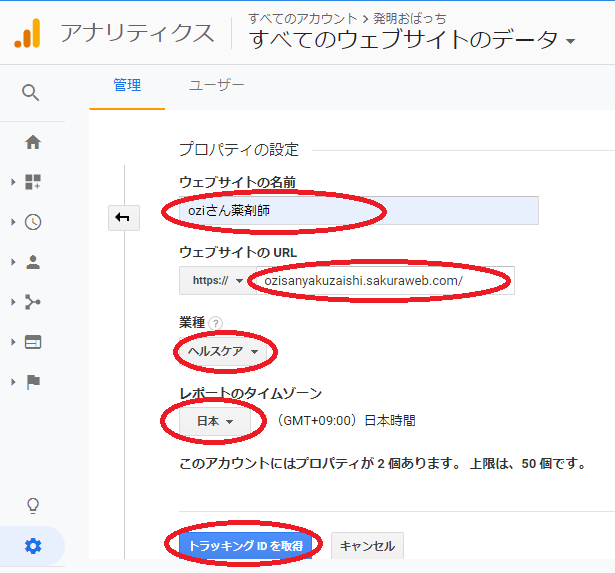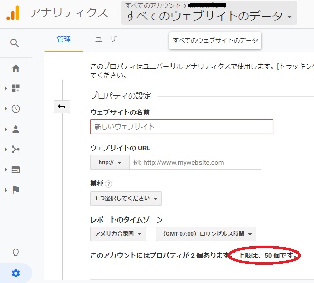 次に「+プロパティ作成」を開いて、赤く囲んだところを見てや、50個ってあるやろ? 1つのアナリティクスアカウントで50個のプロパティが作成できるって事なんや。すなわち、100×50=5000サイト管理できるって事やね。実際にこのブログサイトをアナリティクスに追加していくで~。