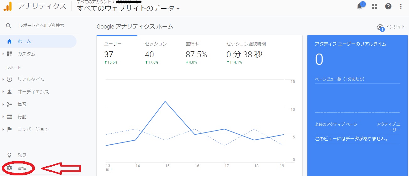 Googleアナリティクスのサイトの画面で説明するね。Googleアカウントでアナリティクスにログインしたホーム画面のなかのアカウントと赤く囲んだ「管理」をクリックするで~。