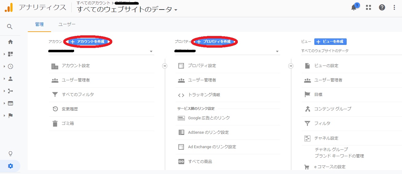 2か所赤く囲んだところがあるやろ?「+アカウント作成」と「+プロパティ作成」。 それぞれ順番にクリックするで?