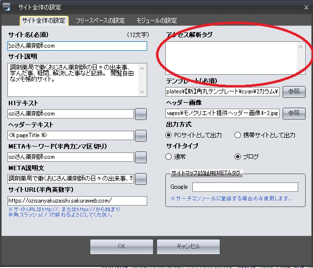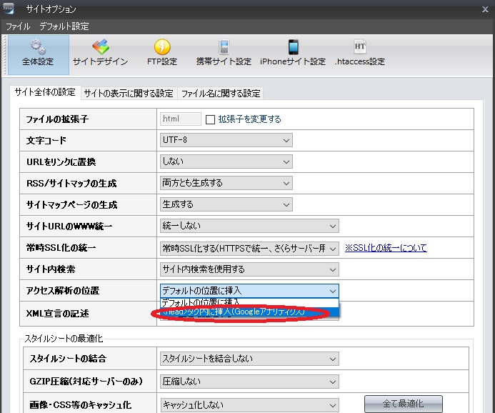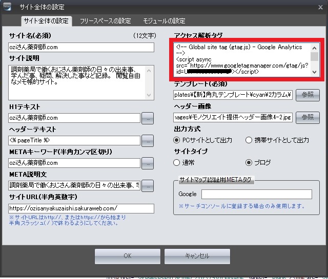 サイト全体設定のアクセス解析タグへコピーしたトラッキングコードを貼り付けて設定完了!! ではなくて、貼り付ける位置の設定が必要やったわ~。