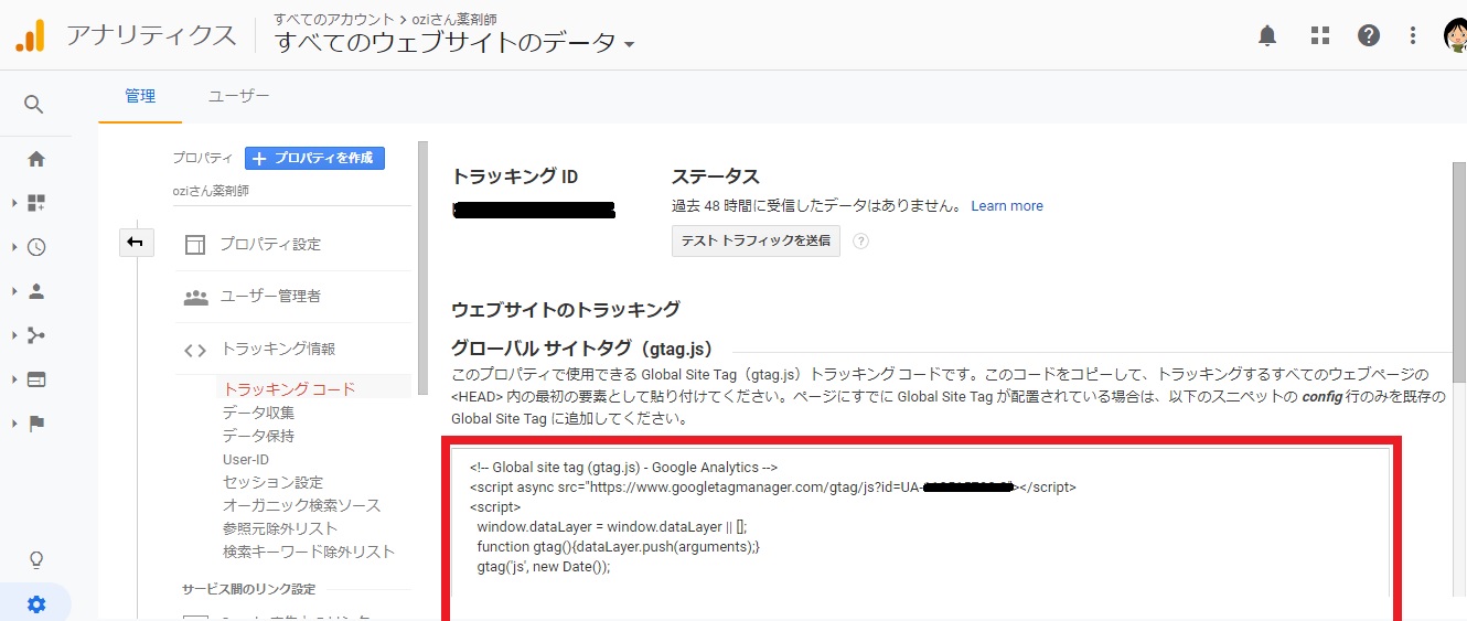 トラッキングIDが取得できたで~。赤く囲んだところにトラッキングコードが表示されているから、これをコピーしてWebサイトに貼り付けるだけやね。